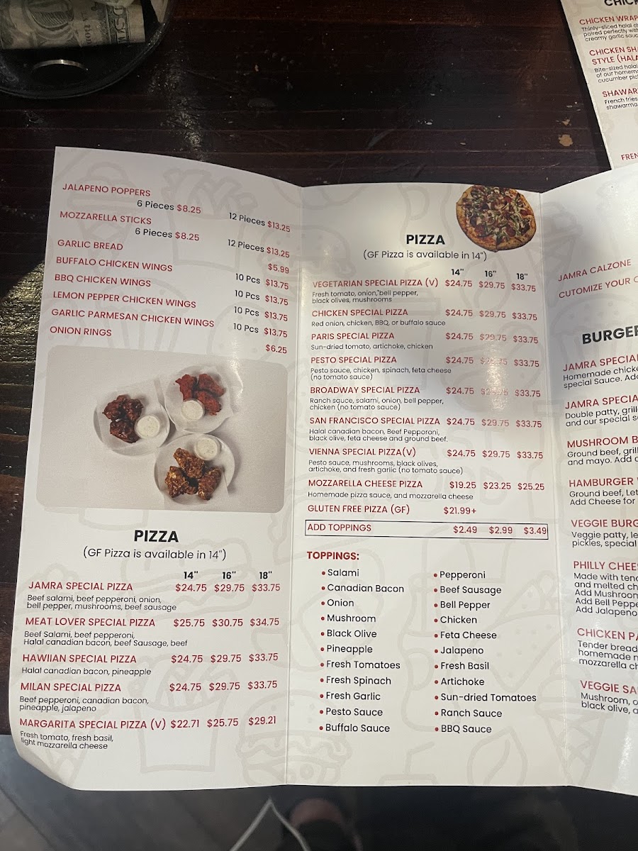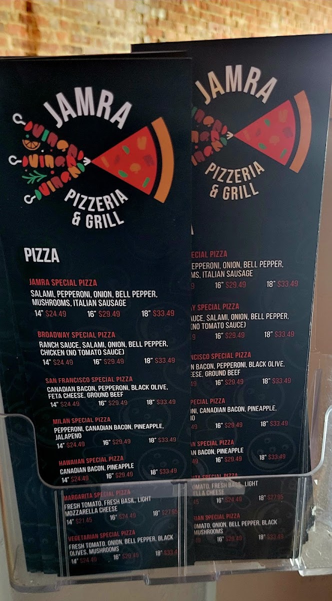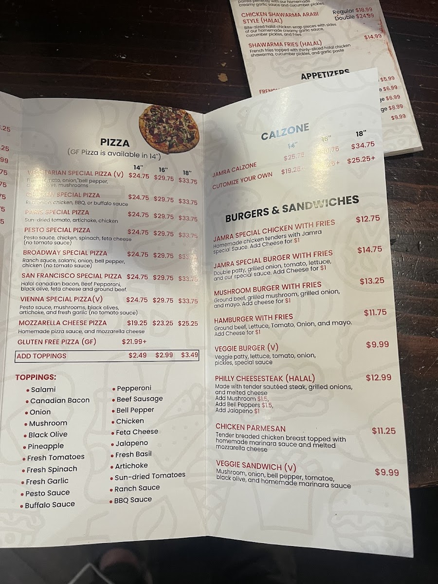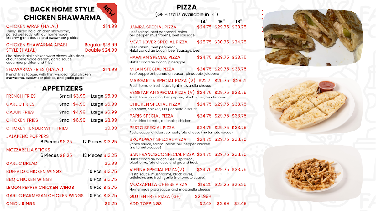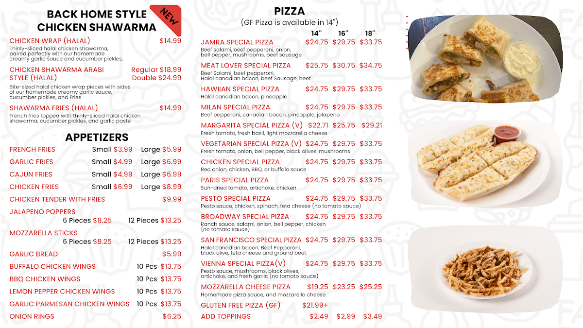 The menu at Jamra Pizzeria & Grill offers a diverse selection of flavorful dishes that cater to a variety of tastes. For those craving something savory, the Back Home Style Chicken Shawarma (new) is a standout, with options like the Chicken Shawarma Wrap ($8.99), Chicken Shawarma Arabi Style ($9.99), and the Shawarma Fries ($7.99), all made with halal meat. Pizza lovers can indulge in the Jamra Special Pizza, Broadway Special Pizza, San Francisco Special Pizza, and Milan Special Pizza ($12.99 each), with a Hawaiian twist on the Hawaiian Special Pizza ($10.99). If you're in the mood for something more stuffed, the Jamra Calzone ($11.99) and Choose Your Own Calzone ($12.99) are sure to hit the spot. Appetizer options range from French Fries ($3.99) to Garlic Fries ($4.49) and Chicken Fries ($5.99). Their burger selection includes the Jamra Special Burger with Fries ($10.99), the classic Hamburger with Fries ($8.99), and the Mushroom Burger with Fries ($9.99). Sandwich lovers can enjoy a Philly Cheesesteak Sandwich ($11.99). For those seeking something fresh, there are various salads like the Caesar Salad ($6.99), Greek Salad ($7.99), and Chicken Salad ($9.99). To satisfy your sweet tooth, the Nutella Pizza 10” ($8.99), Red Velvet Cheesecake ($4.99), and New York Cheesecake ($4.99) are perfect choices. Lastly, beverages include options like Soda ($2.49), Snapple ($2.99), and Gatorade ($2.99), completing a well-rounded menu for every craving.