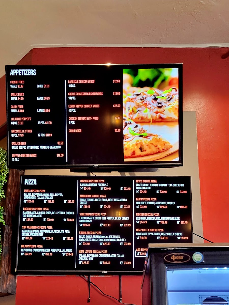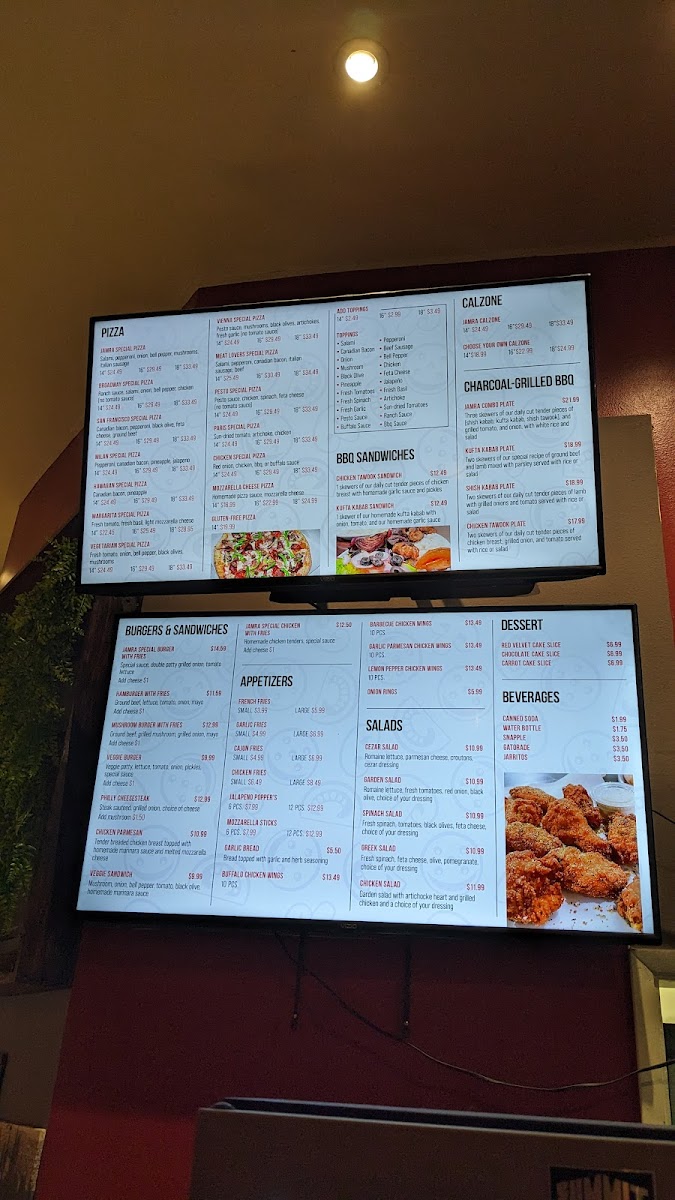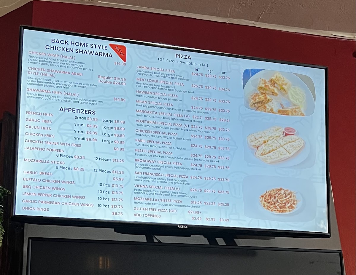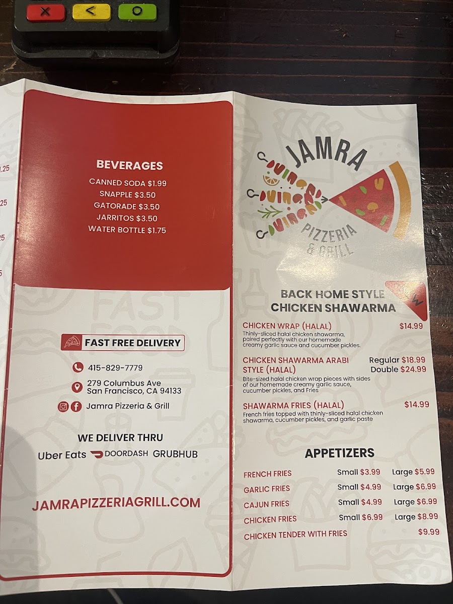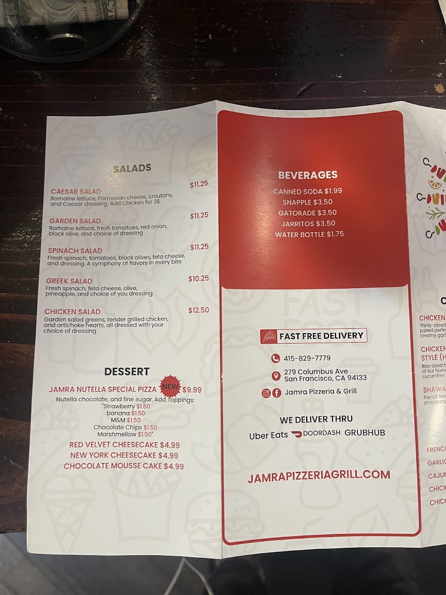 The menu at Jamra Pizzeria & Grill offers a diverse selection of flavorful dishes that cater to a variety of tastes. For those craving something savory, the Back Home Style Chicken Shawarma (new) is a standout, with options like the Chicken Shawarma Wrap ($8.99), Chicken Shawarma Arabi Style ($9.99), and the Shawarma Fries ($7.99), all made with halal meat. Pizza lovers can indulge in the Jamra Special Pizza, Broadway Special Pizza, San Francisco Special Pizza, and Milan Special Pizza ($12.99 each), with a Hawaiian twist on the Hawaiian Special Pizza ($10.99). If you're in the mood for something more stuffed, the Jamra Calzone ($11.99) and Choose Your Own Calzone ($12.99) are sure to hit the spot. Appetizer options range from French Fries ($3.99) to Garlic Fries ($4.49) and Chicken Fries ($5.99). Their burger selection includes the Jamra Special Burger with Fries ($10.99), the classic Hamburger with Fries ($8.99), and the Mushroom Burger with Fries ($9.99). Sandwich lovers can enjoy a Philly Cheesesteak Sandwich ($11.99). For those seeking something fresh, there are various salads like the Caesar Salad ($6.99), Greek Salad ($7.99), and Chicken Salad ($9.99). To satisfy your sweet tooth, the Nutella Pizza 10” ($8.99), Red Velvet Cheesecake ($4.99), and New York Cheesecake ($4.99) are perfect choices. Lastly, beverages include options like Soda ($2.49), Snapple ($2.99), and Gatorade ($2.99), completing a well-rounded menu for every craving.